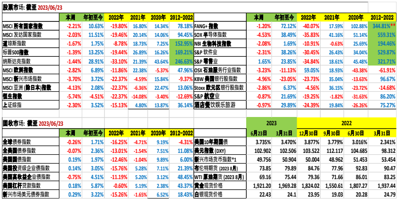 美国的加息周期可能已经走到了尽头(7 月是否再加 25 个基点没什么大不了),而英国和欧洲大陆可能还有相当长的路要走,中国在积极降息。货币政策的分歧正在与经济增长对接,美国的经济衰退总是延迟 3 个月(Janet Yellen 周四表示,美国陷入衰退的几率已经降低),而欧洲的衰退风险(再加息)正在升级。货币政策和经济的分歧明显体现在股市回报上,纳斯达克和标普 500 指数年初至今分别上涨 28.91%和 13.25%,而欧洲 STOXX 600 指数 YTD 上涨 6.65%,英国的 FTSE100 指数基本持平,为 0.14%。MSCI 中国指数 YTD 的回报率是令人失望的 -5.96%。