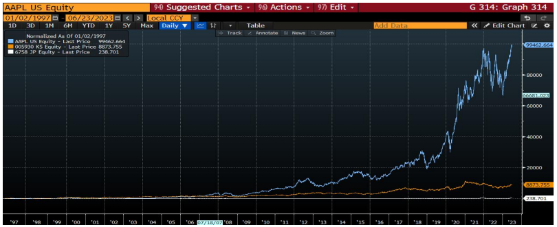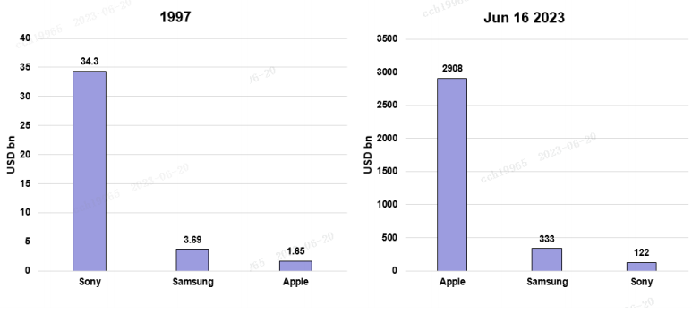 In 1997, Sony’s market cap (US$34.3 billion) was 20.8x that of Apple (US$1.65 billion). On June 16, 2023, Apple’s market cap (US$2,908 billion) was 23.8x that of Sony (US$ 122 billion).