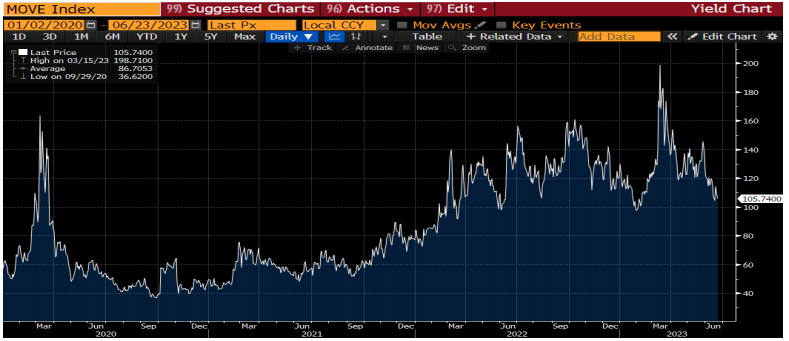 However, interest rate volatility shows a different story. The MOVE index is well off its highs in March this year (post SVB and Credit Suisse), but nevertheless remains quite elevated relative to the period of calm after the 2020 pandemic. The MOVE index is telling us to expect more interest rate volatility.