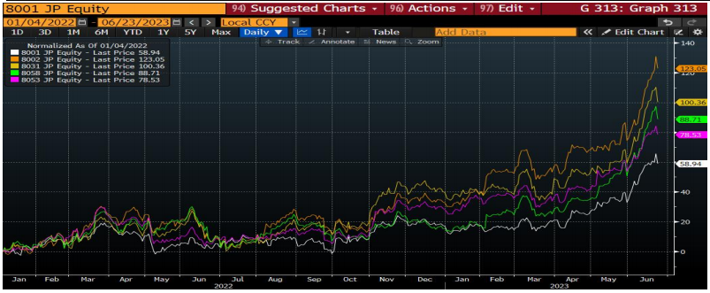 Itochu, Marubeni, Mitsui & Co, Mitsubishi Corp, and Sumitomo Corp: % gain since Jan 4, 2022: