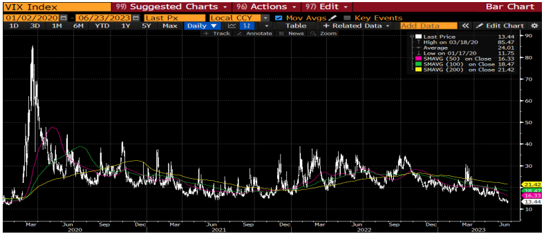 华尔街所谓的 "恐惧指数"--芝加哥期货交易所 S&P500 波动率指数周四跌至 12.73,是 2020年 1 月以来的最低点。VIX 指数也许因其在市场动荡时期的大幅飙升而最为著名(2020 年 3月)。但持续的、较低的指数是牛市的一个标志。