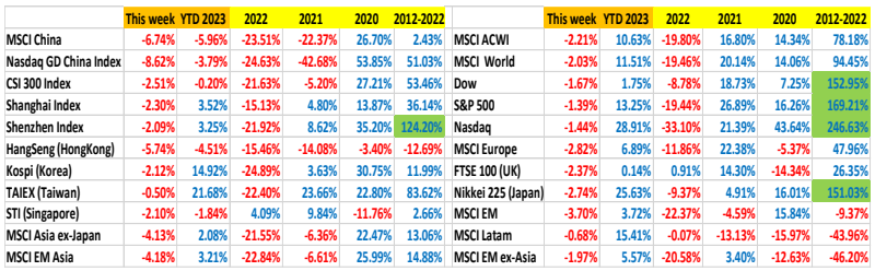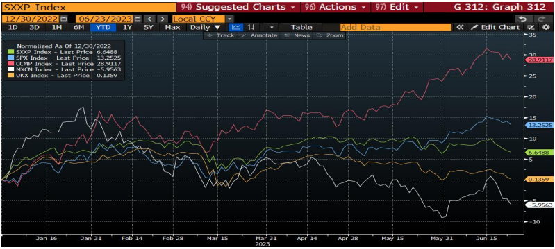 The rate hike cycle in the US is likely to have reached the end (whether another 25bp hike in July won’t move the needle), while UK and continental Europe are likely to have quite a distance to go, and China is actively cutting rates. The monetary policy divergence is dovetailing with economic growth, with the recession in the US always a 3-month delay (Janet Yellen said on Thursday that the odds of US tipping into a recession have diminished), while the recession risk in Europe (with additional rate hikes) is escalating. The monetary policy and economic divergence are clearly manifested in the stock market returns, with the Nasdaq and S&P500 gaining 28.91% and 13.25% respectively YTD, while the European STOXX 600 index is up 6.65% YTD and the FTSE100 in the UK is basically flat at 0.14%. The MSCI China has a disappointing -5.96% return YTD.