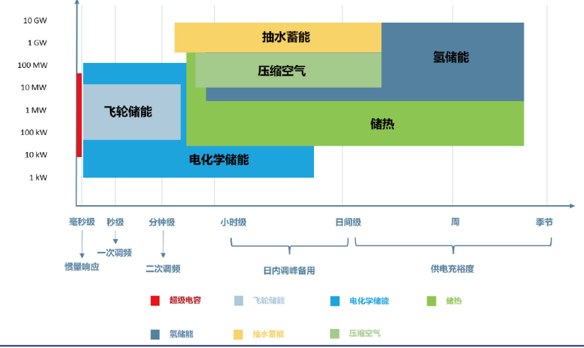 当前,中国储能技术根据不同的时长进行分类,已实现毫秒至分钟级的超导磁储能、超级电容器储能和飞轮储能数十分钟至数小时的电化学储能、抽水蓄能和压缩空气储能以及数天至更长时间的燃料储能等不同时间跨度。