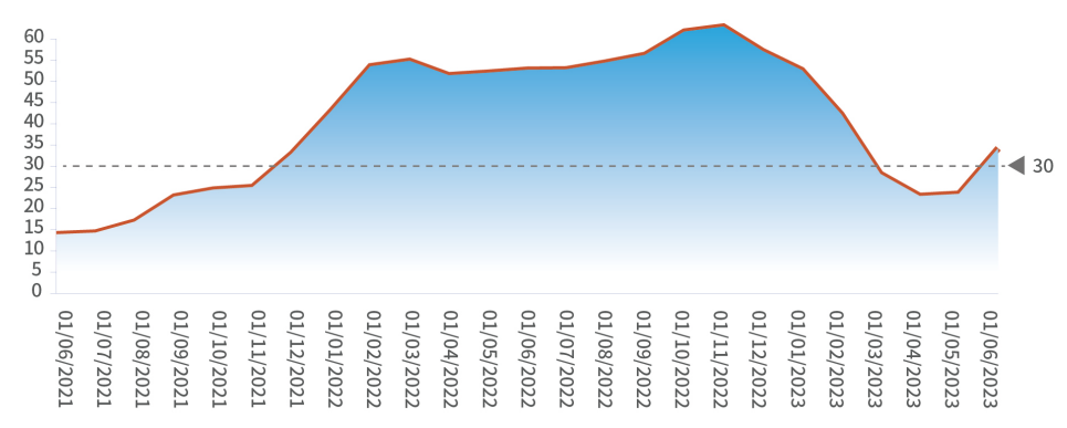 2021/06-2023/06碳酸锂价格(万元/吨)(图来源:EESA储能领跑者联盟《2023中国新型储能行业发展白皮书》)