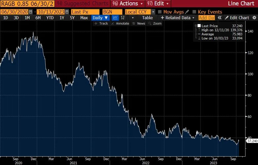 事后看来,奥地利共和国 2120 年 6 月 30 日到期的 46 亿欧元 0.85%债券在 6 个月内是一笔不错的交易。人们本可以在 2020 年 6 月以 100 的价格买入收益率为 0.85% 的 100 年期债券,到 12 月以 140 的价格卖出(6 个月内获得 40% 的资本收益)。顺便提一下,该债券的最后报价为 37。