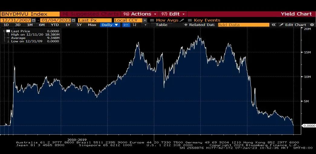 2020 年初 Covid-19 爆发后,全球央行将利率降至零(欧元区、瑞士和日本为负值)。投资界全力追逐收益率。这种疯狂在 2020 年 12 月达到顶峰 (相当于 18.3 万亿美元的负利率债券,在 2022 年开始退出历史舞台,负收益债券在 2023 年 1 月结束。
