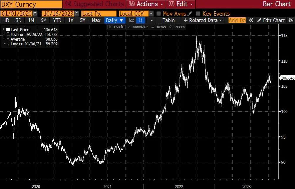 美元指数本周高收于 106.648 点。在全球充满不确定性和地缘政治冲突的时期,全球资本总是在安全的美元中寻求庇护。